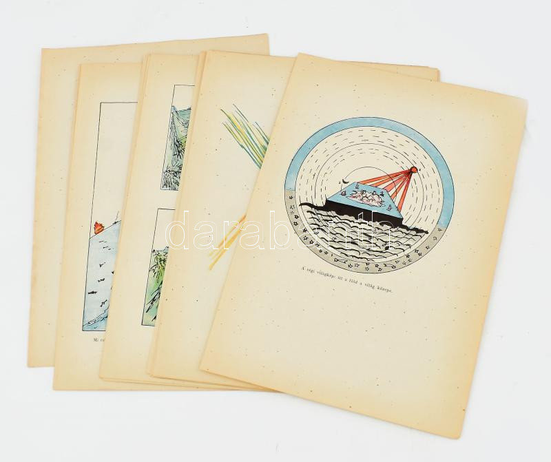 Leírás: A világkép és a földrészek alakulása, 14 db színezett ábra, lapméret: 23,5x16,5 cm