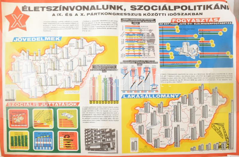 "Életszínvonalunk, szociálpolitikánk a IX. és a X. pártkongresszus közötti időszakban" és "Művelődéspolitikánk a IX. és X. pártkongresszus közötti időszakban", feltekerve, beszakadásokkal,97x68 cm