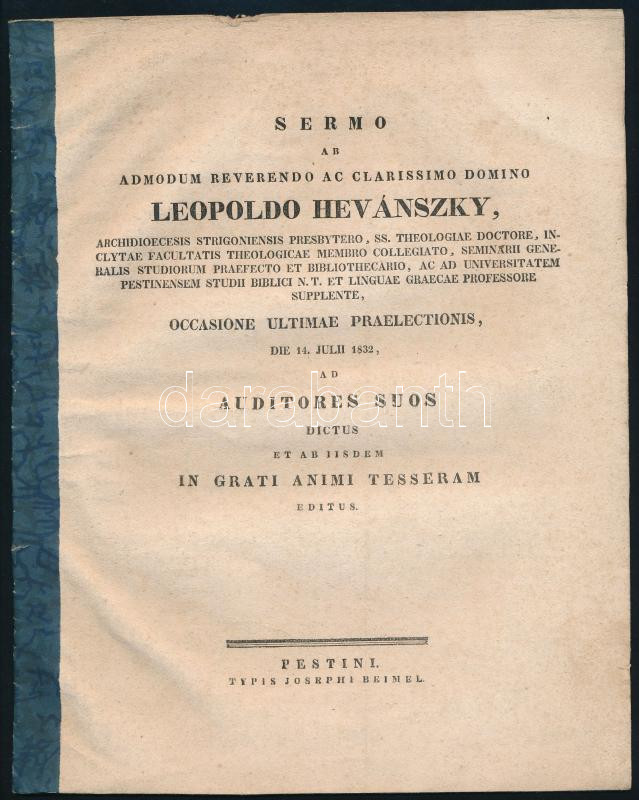 Leírás: Sermo ad admodum reverendo ac clarissimo domino Leopoldo Hevánszky, archidiocesis Strigoniensis presbytero... Pestini,1832. Beimel. 7p.