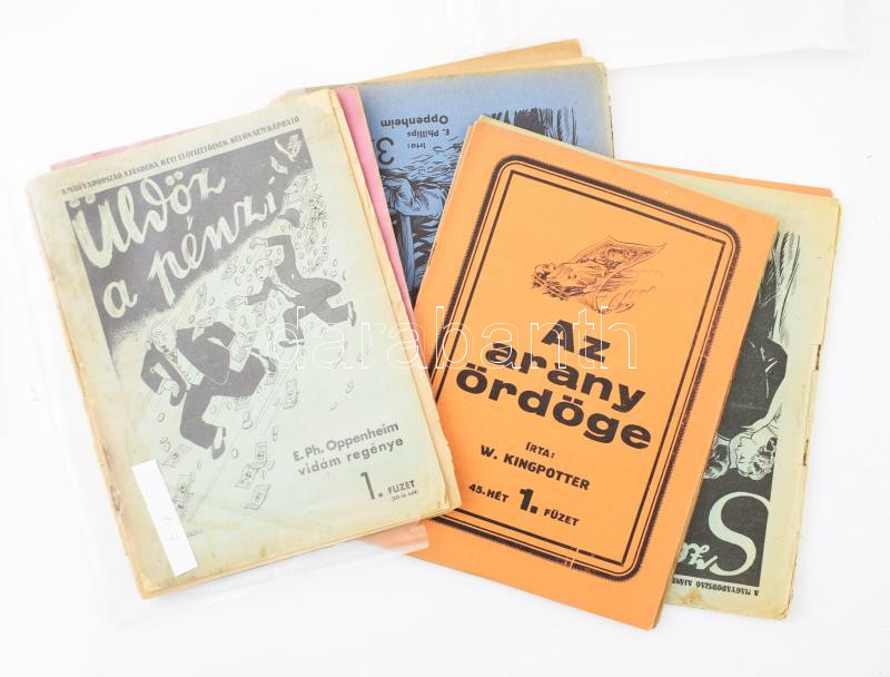 cca 1930 W. Kingpotter: Az arany ördöge 1-6 füzet. E. Phillips Oppenheim: Szerelem és arany 1-5 füzet. Oppemeim: Üldöz a pénz 1-7. ponyva regény mellékletek magazinokhoz .
