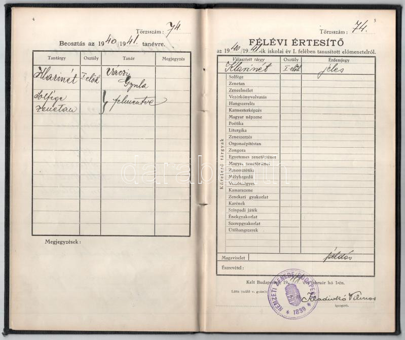 1940-44 Nemzeti Zenede fényképes tanulmányi értesítője, Solti Gabriella izraelita növendék részére, Sugár Viktor és Kladivkó Vilmos igazgatók aláírásaival, papírfelzettel, vászonkötésen kisebb folttal, máskülönben jó állapotban