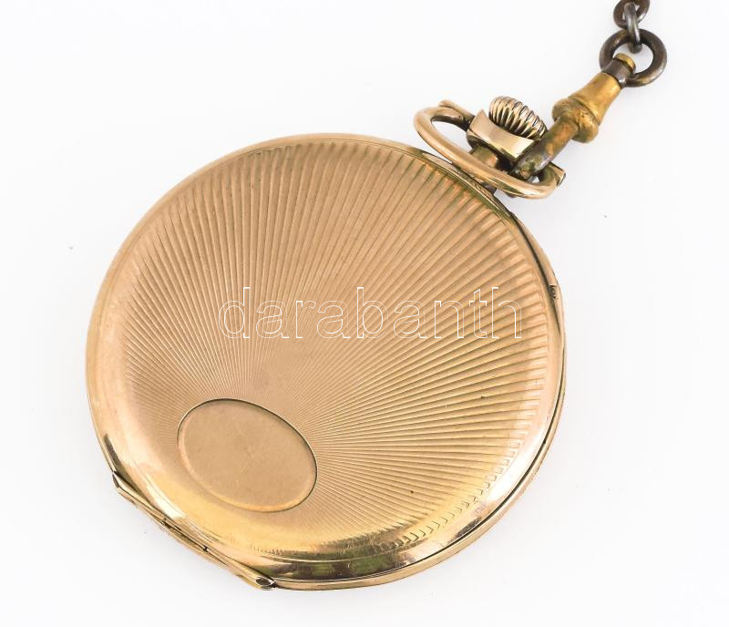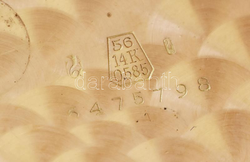 Leírás: 14K arany (Au) Omega zsebóra. Jelzett tok, jelzett arany porvédő, működő, szép állapotban, d: 46 mm. Hozzá óra tok és fém óralánc, bruttó: 59,6 g