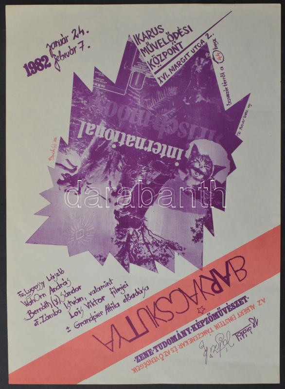 Bernáthy Sándor (1949-2012): Barkácskutya. Az Albert Einstein [Bizottság] Tánczenekar és az ő vendégeik. FeLugossy László, Wahorn András, Bernáth(y) Sándor, efZámbó István valamint Lois Viktor filmjei és Grandpierre Attila előadásai. Zene. Tudomány. Képzőmővészet. 1982. jan. 24 - febr. 7. Ikarus Művelődési Központ, Bp. Underground koncert- és kiállításplakát, ofszet, papír, jelzett a plakáton, 40x28,5 cm.