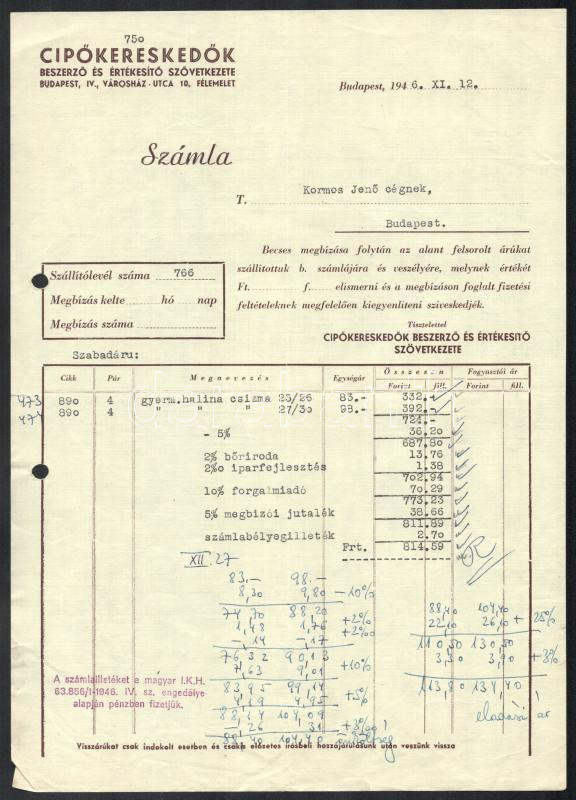 Leírás: 1946 Cipőkereskedők Beszerző és Értékesítő Szövetkezete fejléces számla