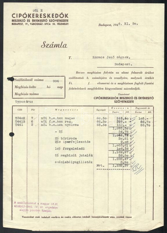 Leírás: 1946 Cipőkereskedők Beszerző és Értékesítő Szövetkezete fejléces számla