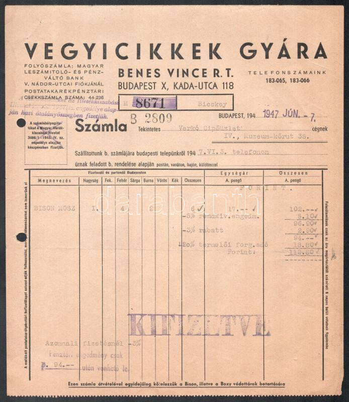 Leírás: 1947 Benes Vince Vegyicikkek Gyára fejléces számla, kis sérüléssel