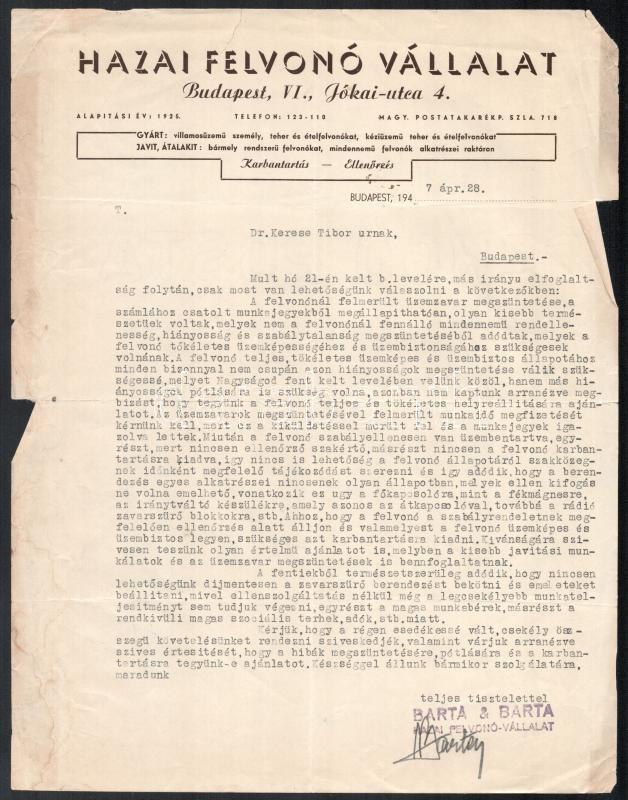 1947 Hazai Felvonóvállalat Barta és Wáspi fejléces levele, szélén szak... https://www.darabanth.com/hu/484-Gyorsarveres/484.0/Mutargy-papirregiseg-egyeb/Reklam~1000002/1947-Hazai-Felvonovallalat-Barta-es-Waspi-fejleces-levele-szelen-szakadassal~II3246938