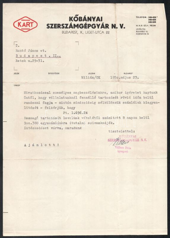 1950 Kőbányai Szerszámgépgyár fejléces számla https://www.darabanth.com/hu/484-Gyorsarveres/484.0/Mutargy-papirregiseg-egyeb/Reklam~1000002/1950-Kobanyai-Szerszamgepgyar-fejleces-szamla~II3247009