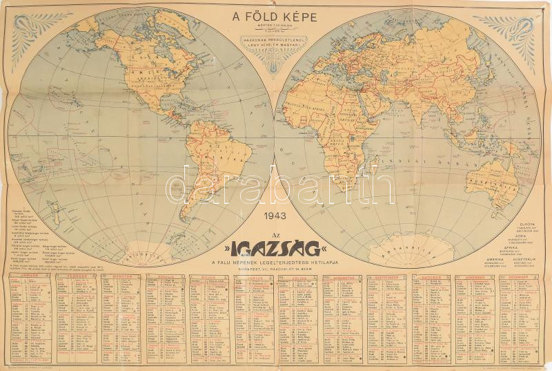 Leírás: 1943 A föld képe, 1:50.000,000, 1943-as naptárral, Bp., Igazság, hajtva, 58x82 cm