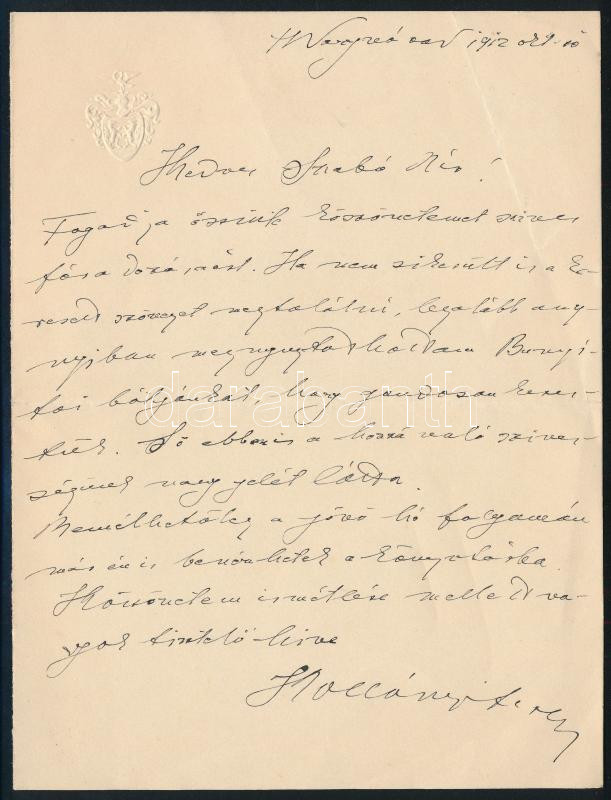 1912 Nagyvárad, Kollányi Ferenc (1863-1933) római katolikus pap, egyháztörténész, könyvtáros, levéltáros, az MTA tagjának autográf levele, egy beírt oldal, benne Bunyitay Vince (1837-1915) nevének említésével, dombornyomott címeres levélpapíron
