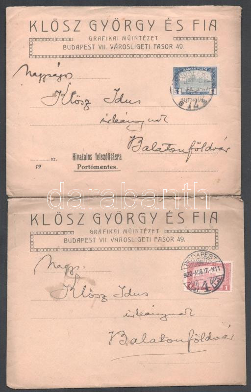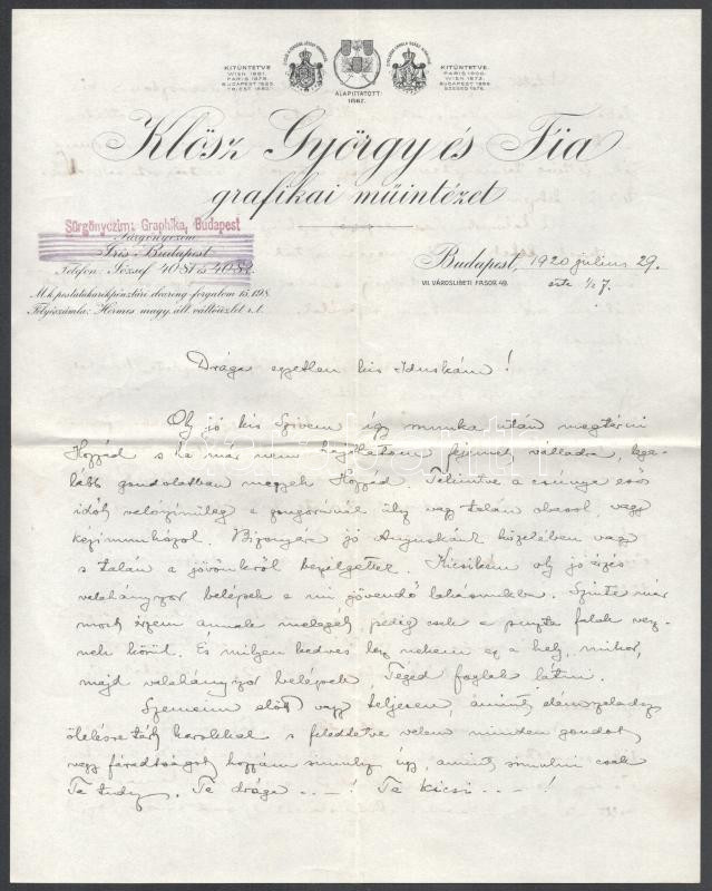 1920 Klösz Ida (1899-1979), Klösz Pál (1874-1954) m. kir. kormányfőtanácsos, a Klösz György és Fia Grafikiai Műintézet tulajdonosa lányának szóló levelek, 2 db, későbbi férjétől, Kölley Lászlótól (1892-1977), a Klösz György és Fia Grafikai Műintézet 3 db fejléces papírján és eredeti céges borítékokkal.