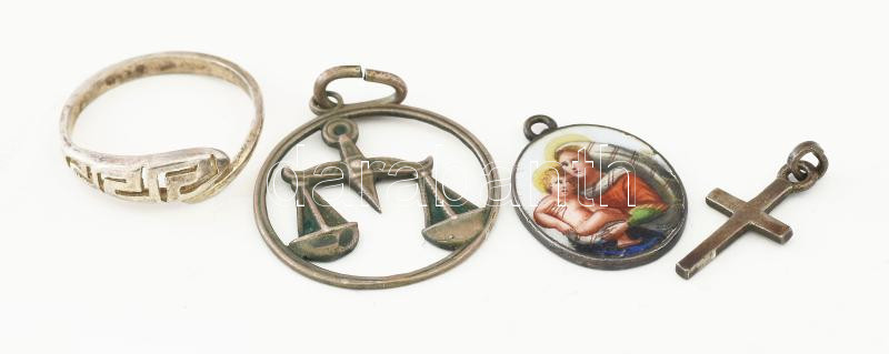 Leírás: Ezüst (Ag) vegyes kegytárgy + ékszer tétel, 4 db, jelzéssel és jelzés nélkül, bruttó: 7,4 g
