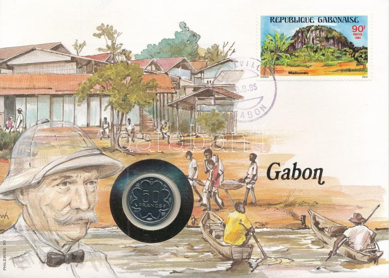 Gabon 1981. 50Fr felbélyegzett borítékban, bélyegzéssel, német nyelvű leírással T:UNC Gabon 1981. 50 Francs in envelope with stamp and cancellation, with German description C:UNC