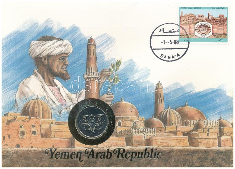 Jemen 1985. 50f Cu-Ni felbélyegzett borítékban, bélyegzéssel, német nyelvű leírással T:UNC Yemen 1985. 50 Fils Cu-Ni in envelope with stamp, cancellation and a prospectus in german C:UNC