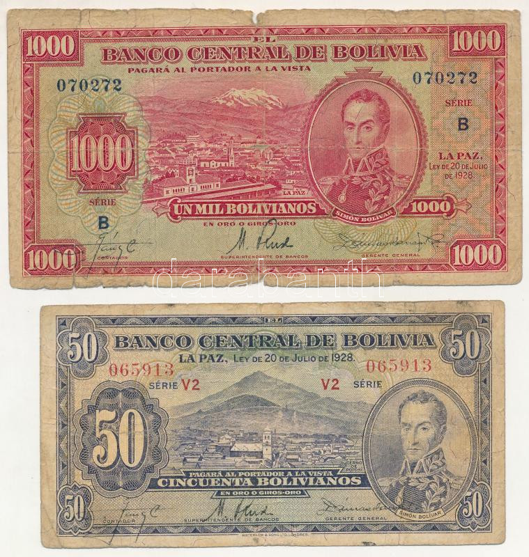 Bolivia 1928. 50 Bolivianos + 1000 B... https://www.darabanth.com/hu/484-Gyorsarveres/484.0/Numizmatika/Kulfoldi-bankjegyek~500014/Bolivia-1928-50B-plus-1000B-TVG-G3Cbr-3E-Bolivia-1928-50-Bolivianos-plus-1000-Bolivianos-CVG-G3Cbr-3E-~II3262430