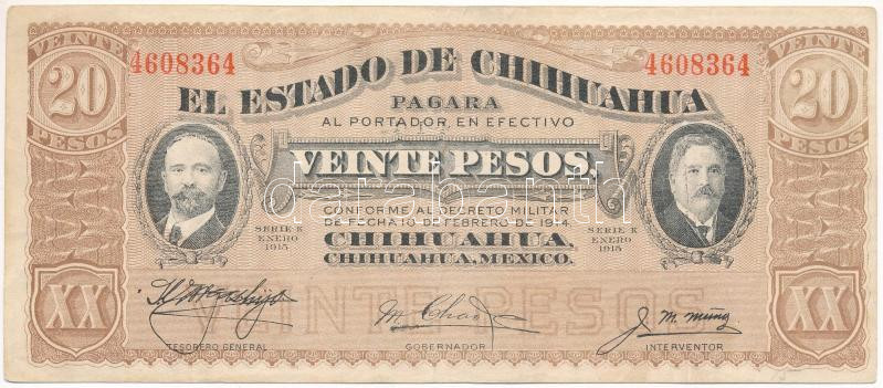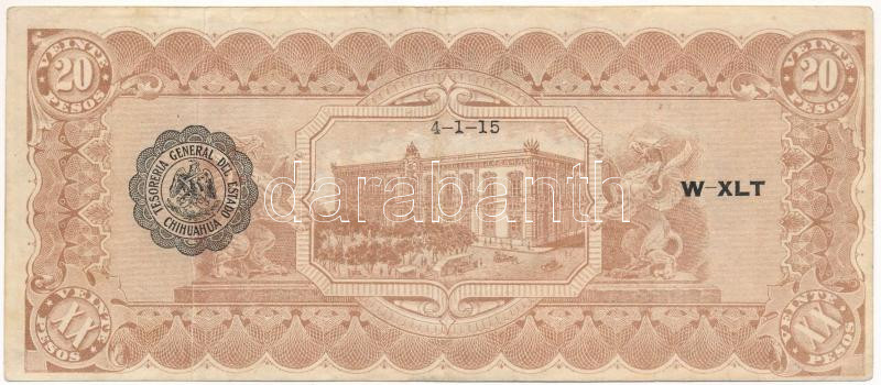 Mexikó / Forradalom / Chihuahua 1915. 20P "K" sorozat, hátoldalán fekete karélyos felülbélyegzéssel és dátummal T:F