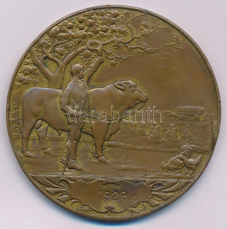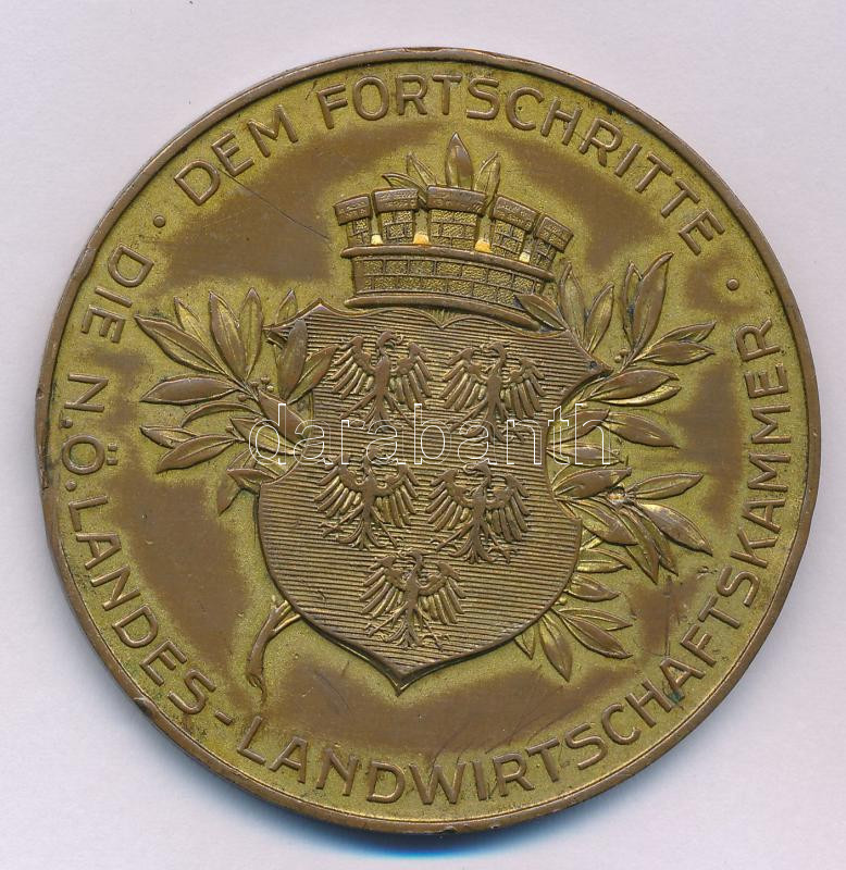 Ausztria 1929. "Dem Fortschritte - Die Niederösterreiches Landes-Landwirtschaftskammer (A haladásért - Alsó-Ausztriai Állami Mezőgazdasági Kamara)" kétoldalas, aranyozott bronz érdemérem, hátoldalán "1929" gravírozással (55mm) T:AU aranyozás lekopott