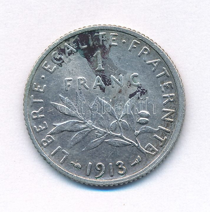 France 1913. 1 Franc Ag C:VF p... https://www.darabanth.com/hu/484-Gyorsarveres/484.0/Numizmatika/Kulfoldi-fem-es-ezustpenzek~500015/Franciaorszag-1913-1Fr-Ag-TVF-patina3Cbr-3E-France-1913-1-Franc-Ag-CVF-patina~II3292428