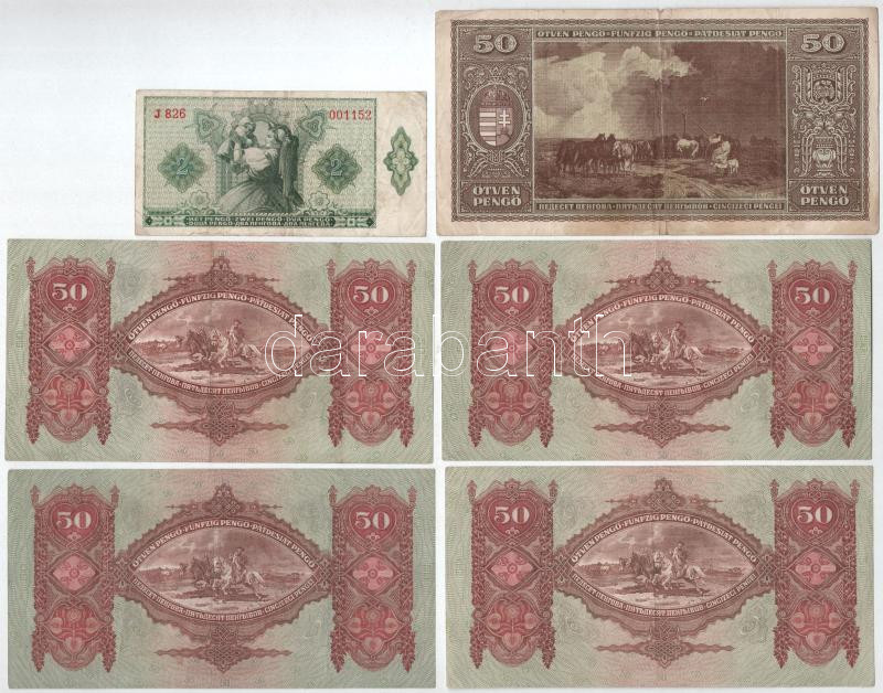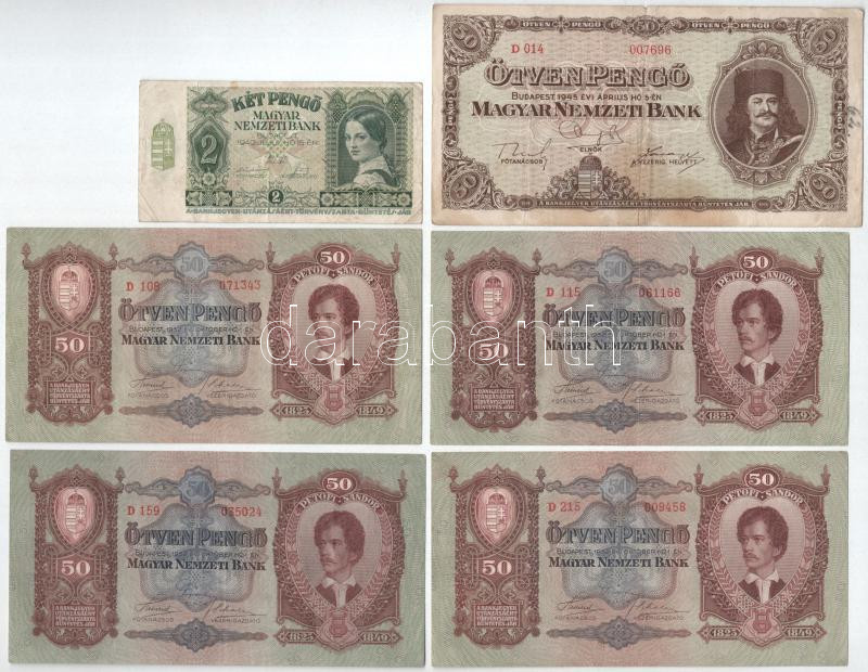 Leírás: 1932. 50P (4x) + 1940. 2P + 1945. 50P T:F közte szép papír