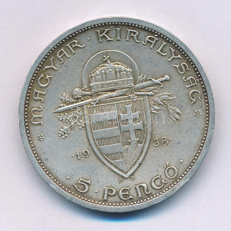 Adamo P8.1 https://www.darabanth.com/hu/484-Gyorsarveres/484.0/Numizmatika/Magyar-es-magyar-verdejelu-fem-es-ezustpenzek~500009/1938-5P-Ag-Szent-Istvan-TAU-XF-patina3Cbr-3E-Adamo-P81~II3284085