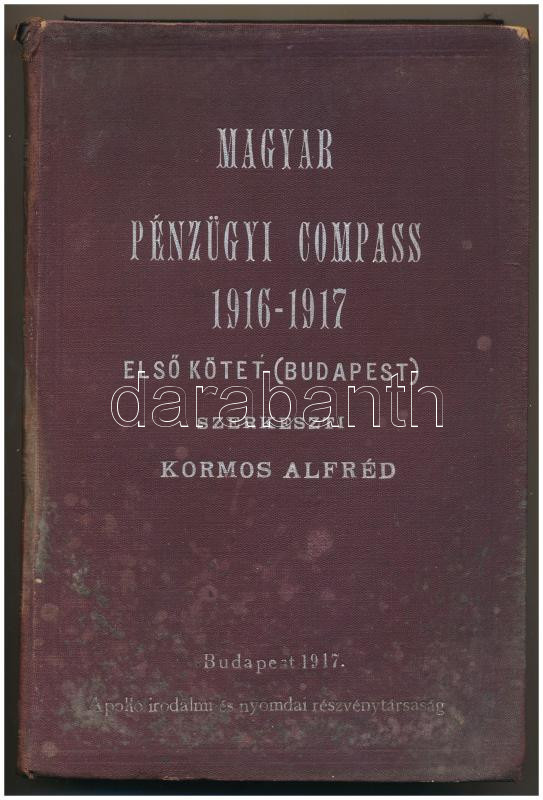 Kormos Gyula (szerk.): Magyar Pénzügyi Compass 1916-1917. I. kötet: Budapest. 26. évfolyam. Budapest, Apolló Irodalmi és Nyomdai Részvénytársaság, 1917. Sérült gerinc, használt állapotban.