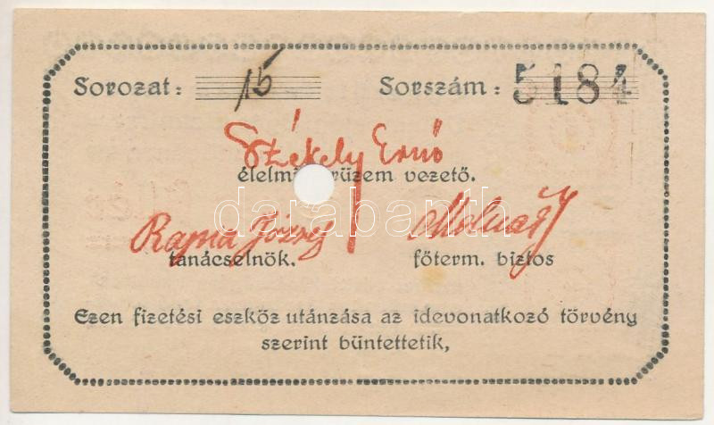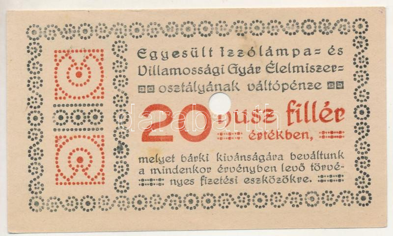 Budapest ~1920. 20f "Egyesült Izzólámpa Villamossági Gyár" l... https://www.darabanth.com/hu/484-Gyorsarveres/484.0/Numizmatika/Papir-es-fem-szuksegpenzek~500007/Budapest-7E1920-20f-Egyesult-Izzolampa-Villamossagi-Gyar-lyukasztassal-ervenytelenitve-T~II3253602