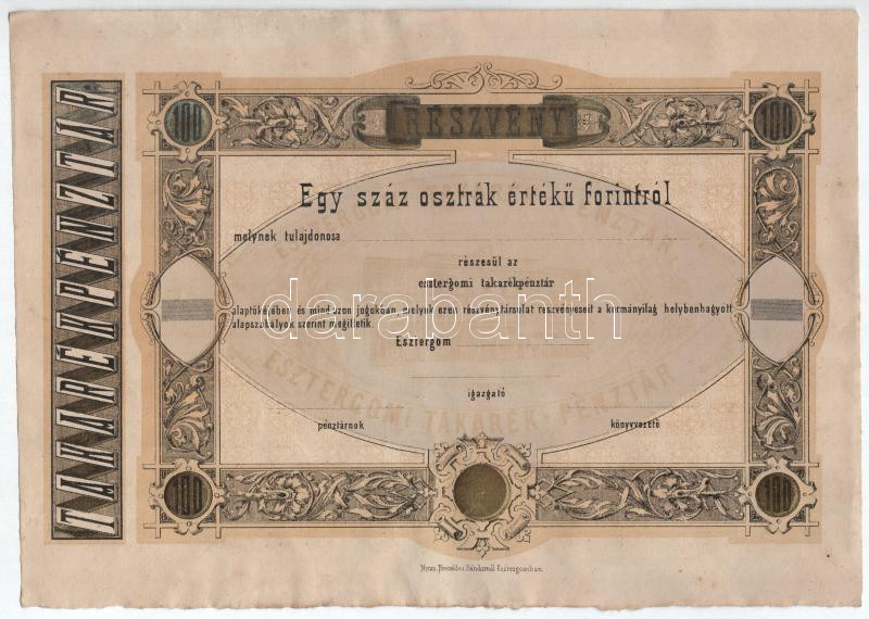 Leírás: 1868-1892. Esztergom "Esztergomi Takarékpénztár " kitöltetlen részvénye 100Ft-ról, szárazpecsét nélkül T:AU,XF