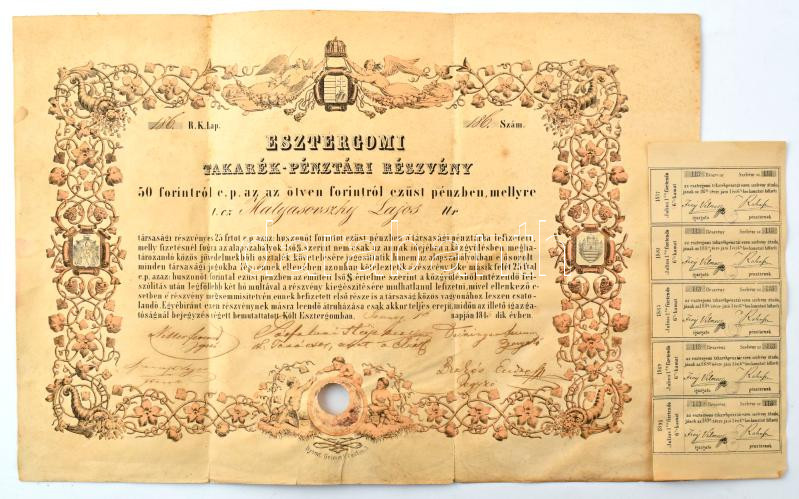 Leírás: Esztergom 1845. "Esztergomi Takarék-Pénztári Részvény" 50Ft-ról szelvényekkel, lyukasztással T:F fo.