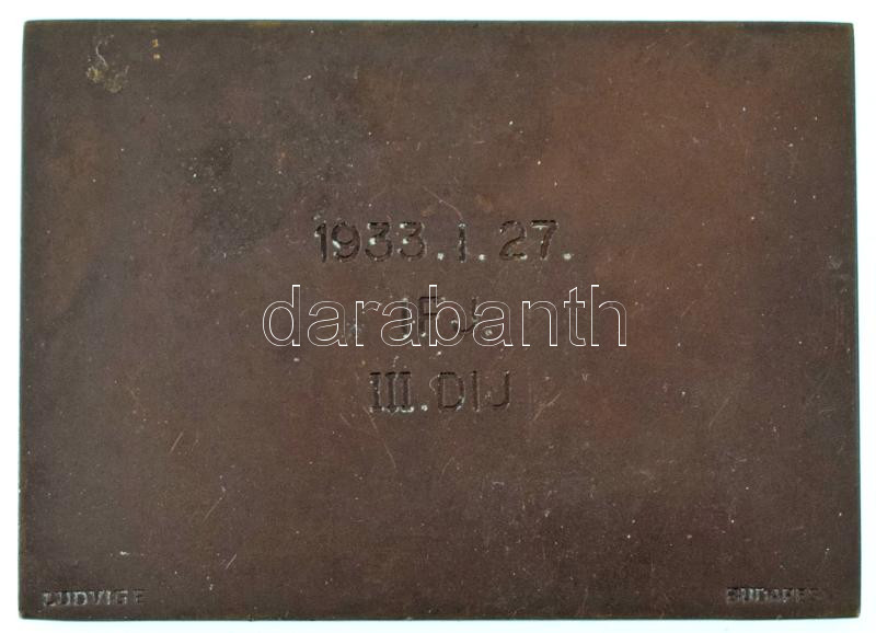 Berán Lajos (1883-1943) 1934. "Magyar Sí Szövetség" bronz díjplakett hátoldalán "1933.I.27. IFJ. III. DIJ" gravírozással és "LUDVIG E BUDAPEST" gyártói jelzéssel (57x41mm) T:XF patina