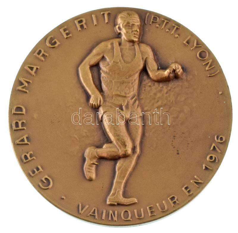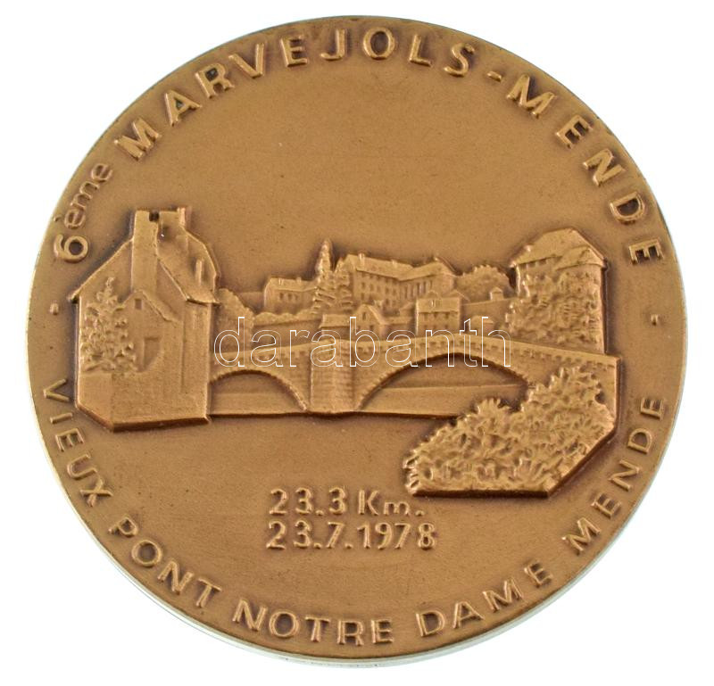 Leírás: Franciaország 1978. "6. Marvejols-Mende félmaraton - 23,3 km - 1978. 7. 23. - A mende-i Régi Notre Dame-híd / Gerard Margerit (PTT Lyon) - 1976-os győztes" peremén jelzett bronz emlékérem (50mm) T:AU France 1978. "6th Marvejols-Mende half-marathon - 23,3 km - 23.7.1978 - The Old Notre Dame bridge in Mende / Gerard Margerit (PTT Lyon) - 1976 winner" bronze commemorative medal, hallmarked on the edge (50mm) C:AU
