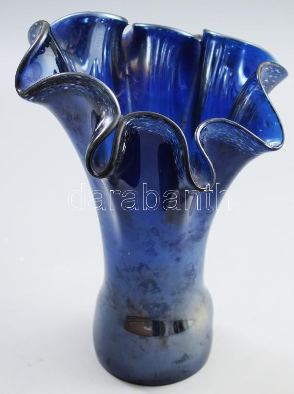Leírás: Fodros üveg váza, irizáló festéssel. Formába öntött, alján kis pattogzással 24 cm