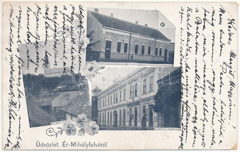 Leírás: 1900 Érmihályfalva, Valea lui Mihai; Casino, református templom, Nemzeti Szálloda, Kiházasító Egyleti Iroda, Tolnai üzlete. Beck Adolf kiadása / casino, Calvinist church, hotel, shops. floral (EM)