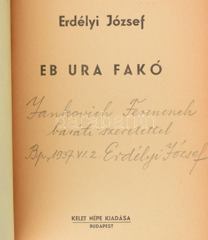 Erdélyi József: Eb ura fakó. A szerző, Erdélyi József (1896-1978) háromszoros Baumgarten-díjas költő által Jankovich Ferenc (1907-1971) Kossuth-, József Attila- és Baumgarten-díjas költő, író, műfordító részére DEDIKÁLT példány. Bp.,[1938.],Kelet Népe, 58+6 p. Első kiadás. Kiadói papírkötés, foltos borítóval, javított kötéssel.