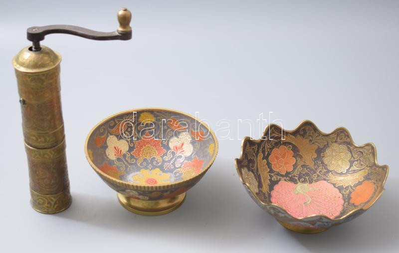 Leírás: Réz daráló kávé örlő + 2 db zománc festett réz tál. 22 cm