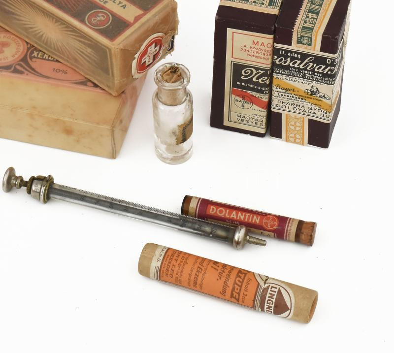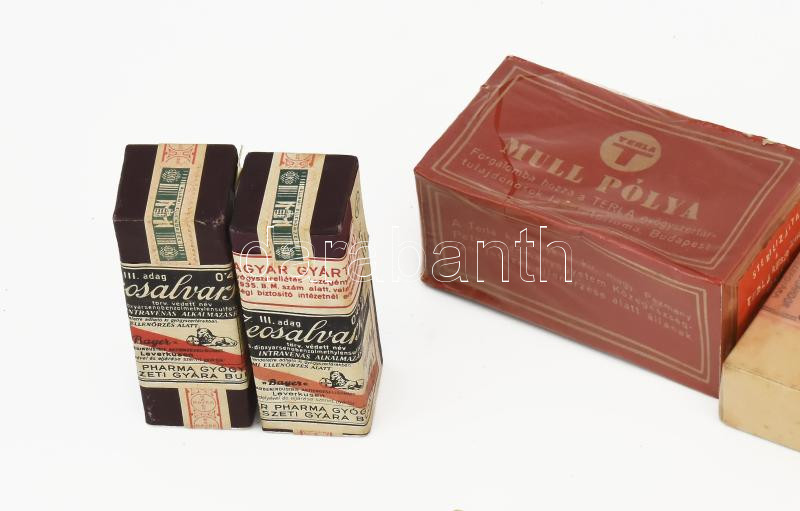 Leírás: cca 1910-1940 Gyógyszer és kötszer tétel: sebpólyák, jódfiolák, Mull-pólya, gyógyszeres fiola, géz, Salvarsal gyógyszer, nagyrészt bontatlanok.