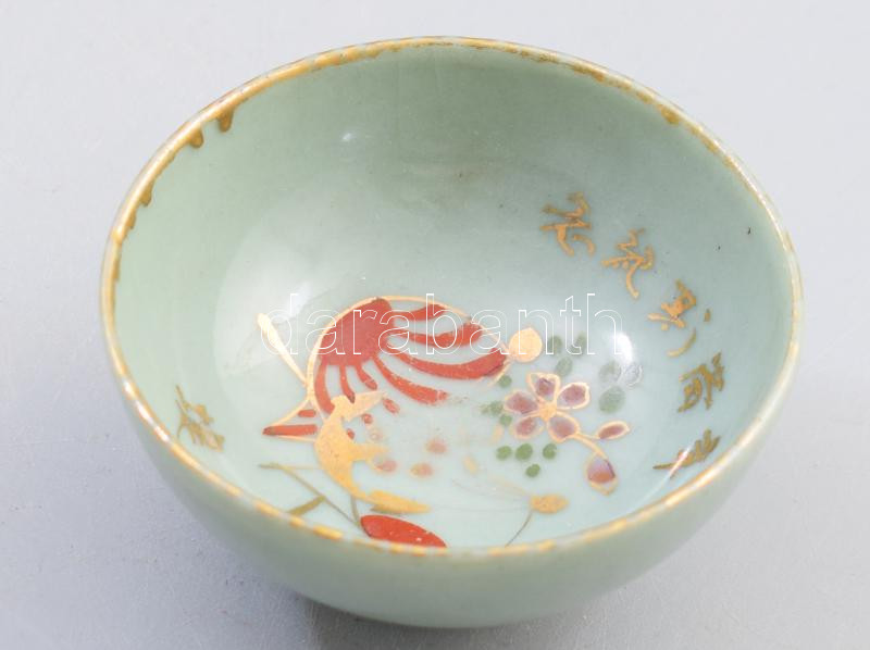Leírás: Japán porcelán katonai szakés csésze. cca 1940-1944, haditengerészet, kalligrafikus, zászló és vasmacska díszítésekkel, d: 6 cm