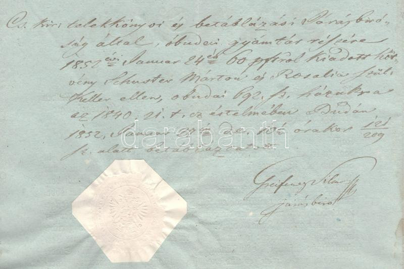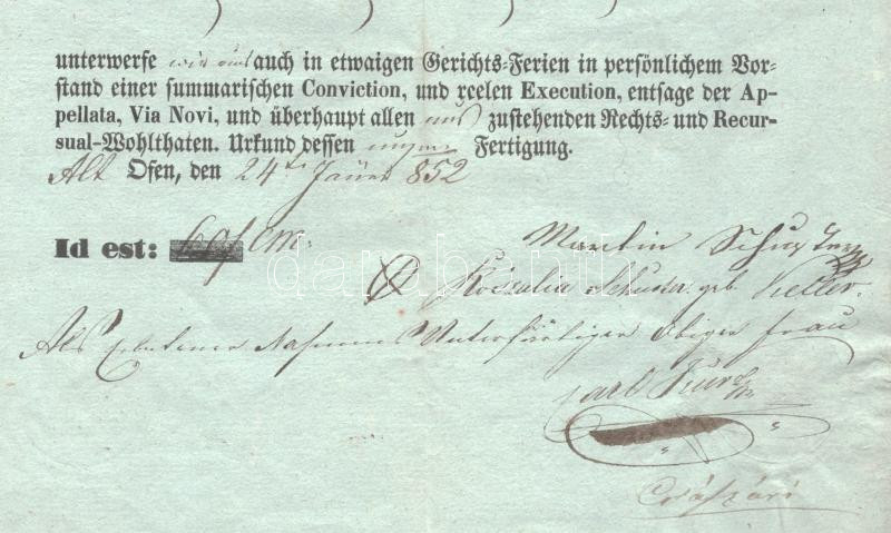 Leírás: 1852 Óbuda (Altofen), adóslevél (Schuld-Schein), 2 db szárazbélyegzővel, 10 krajcár nyomatott okmánybélyeggel, német és magyar nyleven