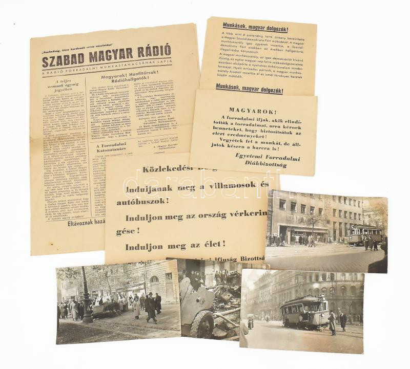 Leírás: 1956 Forradalom esmények a Blaha Lujza tér környékén: szétlőtt villamos, tömeg, 4 db korabeli fotó 14x9 cm + 4 db forradalmi politikai röplap.