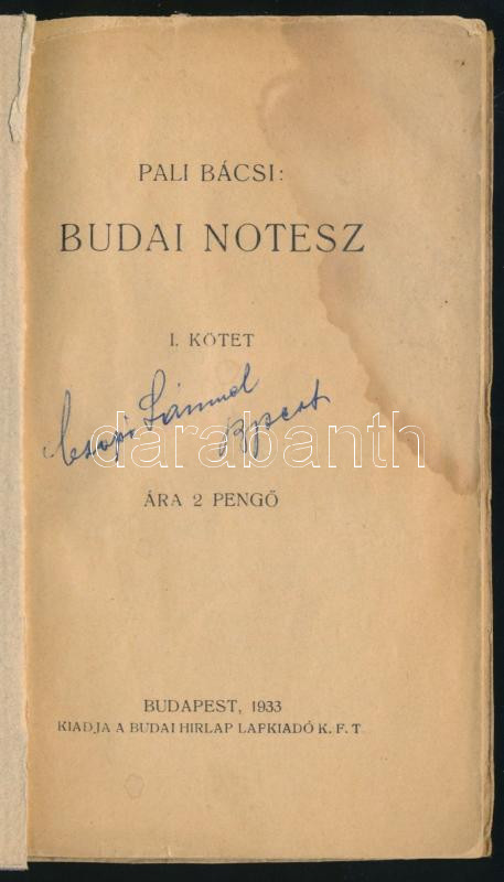 Leírás: [Joanovich Pál] Pali Bácsi: Budai notesz I. Bp., 1933, Budai Hírlap Lapkiadó Kft.,("Élet"-ny.), 88 p. Unicus kötet. Papírkötés, pótolt borítóval, foltos lapokkal.