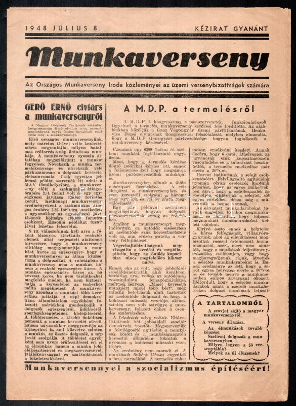 1948 Munkaverseny. Az Országos Munkaverseny Iroda közleményei az üzemi versenybizottságok számára. 1948. július 8. (Kézirat gyanánt). Néhány kisebb lapszéli szakadással, 8 p.