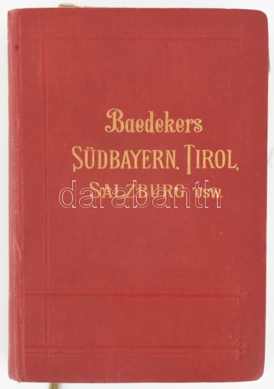 Baedeker, Karl: Südbayern, Tirol, Salzburg, Ober- und Nieder-Österreich, Steiermark, Kärnten und Krain. Handbuch für Reisende von - - . Leipzig, 1914, Karl Baedeker, XXVI+677+(1) p. Oldalszámozáson kívül kihajtható térképekkel, panorámaképekkel. Német nyelven. Kiadói aranyozott egészvászon-kötés, festett lapélekkel, helyenként kissé sérült lapokkal, a lapok egy része kijár.