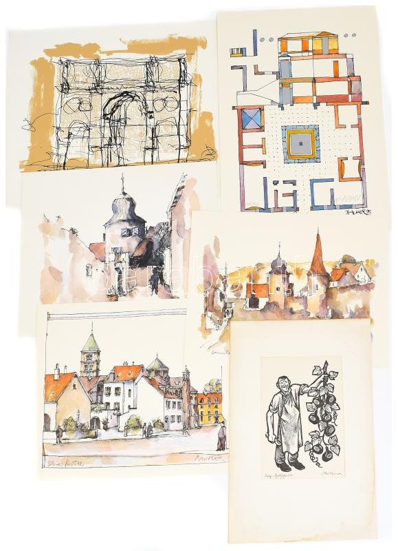 Bauer jelzéssel v. olvashatalan jelzéssel, 6 db mű: Aschaffenburg Pompejanum, Schweinfurti részletek stb. Nyomat, papír. Részben számozott. Egyik paszpartuban, paszpartu széle kissé foltos. Klf. méretekben.