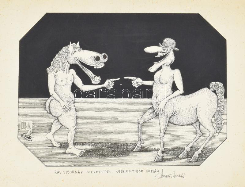 Dunai Imre (1939-2004): Egymásra mutogatók (karikatúra). ?Tus, papír, jelzett. Rau Tibor (1934-2009) karikaturistának szóló ajánlással 1993-ból. Lapszéli apró foltokkal és apró szakadással. 20x26,5 cm