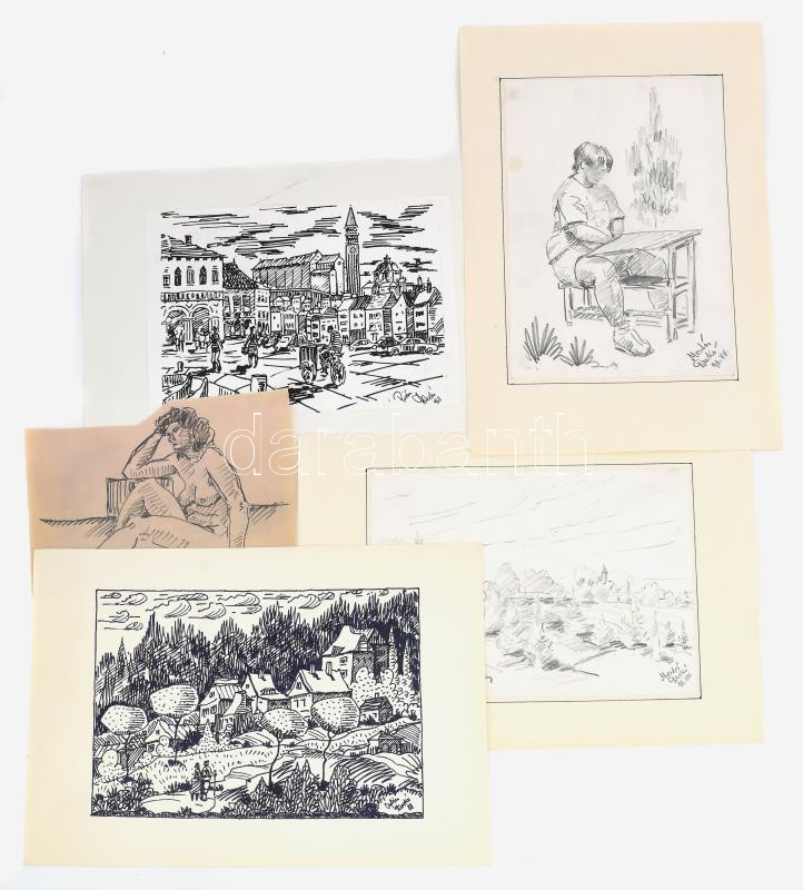 Durkó Gábor (1916-2003), össz. 5 db mű: Női akt, városképek és tájak (Mosdós, Piran, stb.) . Klf. technikák (monotípia, filctoll, golyóstoll, ceruza stb.), papír, kettő kivételével mind jelzett, részben lapszéli apró szakadásokkal és sérülésekkel, 21x29,5 és 30x42 cm közötti méretekben
