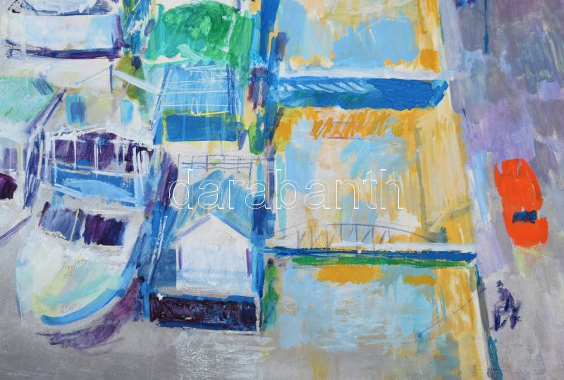 Leírás: Gulyás Dénes (1927-2003): Budapesti Dunapart hajókkal. Olaj, farost, jelzés nélkül. Apró felületi sérülésekkel. 100x100 cm