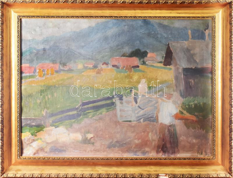 Leírás: Jakuba János (1909-1974): Kaszáló. Olaj, vászon, jjl.: Jakuba. 60x80 cm. Dekoratív, sérült fakeretben.