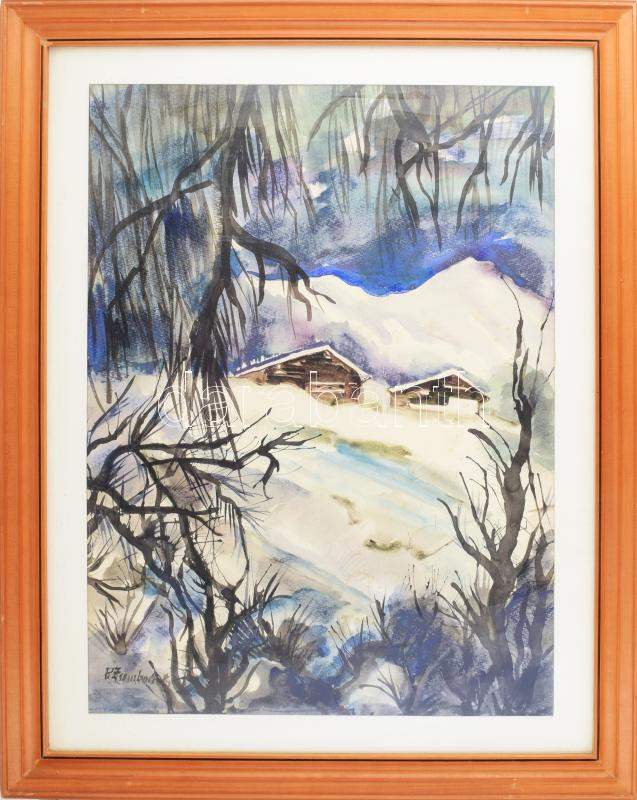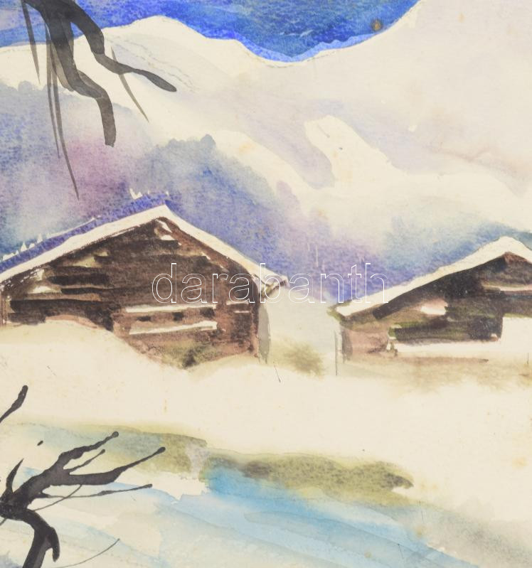 Leírás: Póka Zsombori Erzsébet (1913-1997): Erdélyi téli táj. Akvarell, papír, jelzett. Hátoldalán román kiviteli bélyegzővel. Üvegezett fakeretben. 64x47 cm