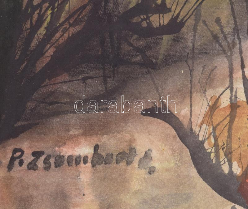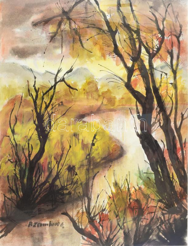 Póka Zsombori Erzsébet (1913-1997): Vízparti erdélyi táj. Akvarell, papír, jelzett. Hátoldalán román kiviteli bélyegzővel. Üvegezett fakeretben. 60x47 cm