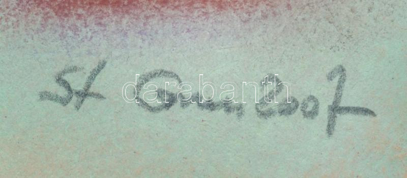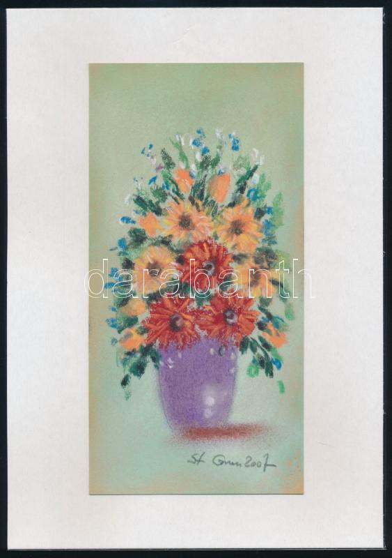 Leírás: Stefan Grecu (?-?): Virágcsendélet. Pasztell, tus, papír, jelzett, paszpartuban, 20x10 cm