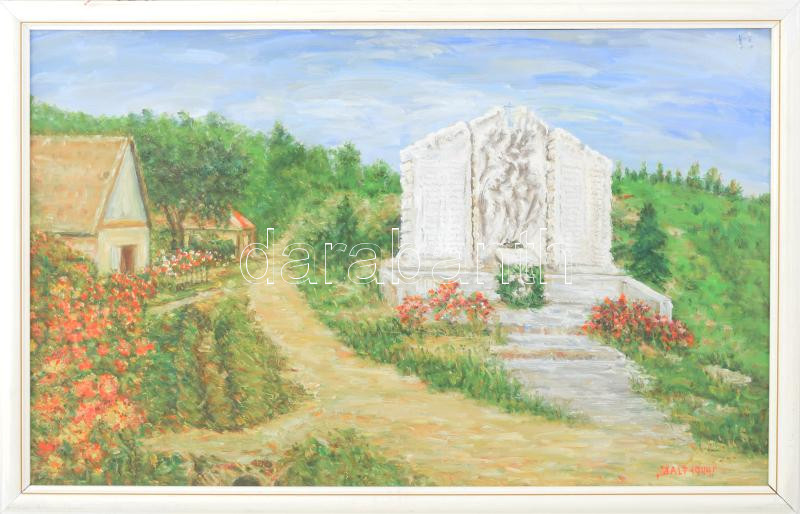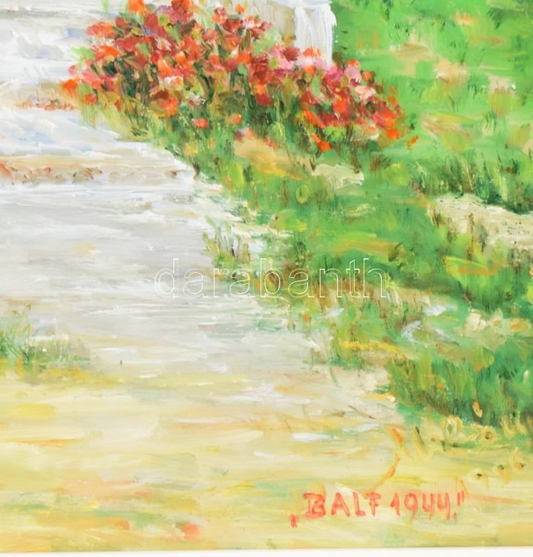 Leírás: Urbán Sándor (1965-): Balfi memento, 1944. Olaj, farost, jelzett a hátoldalán, fakeretben, 40×65 cm